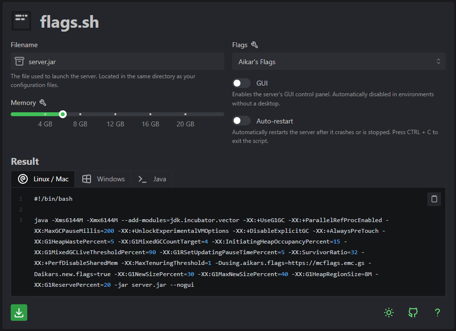 На этом сайте Вы сможете скопировать уже подготовленные аргументы запуска для вашего сервера, с возможностью регулировки выделенной памяти.