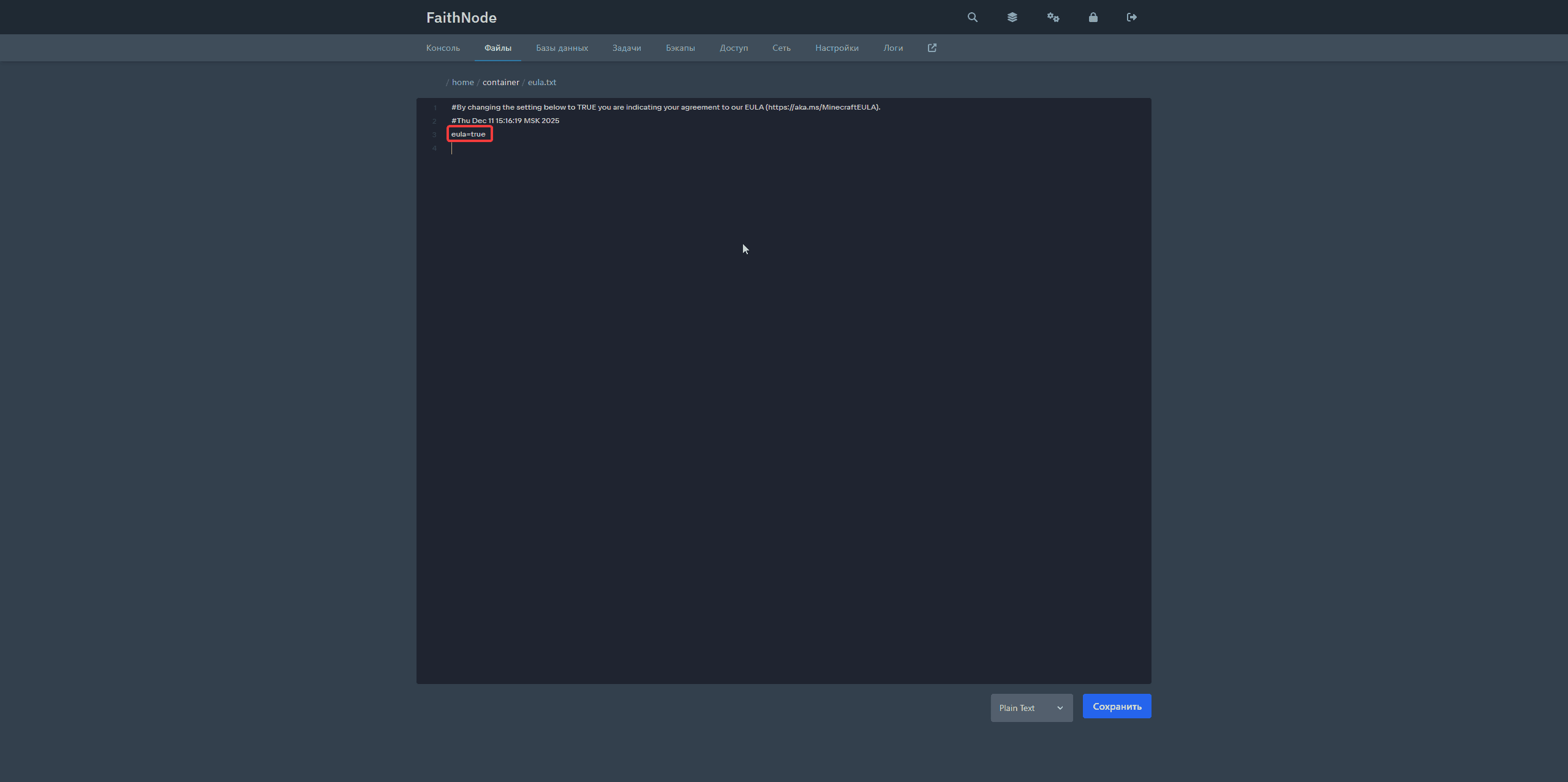 После запуска сервера, он выключится - это нормально, потому что мы удалили все файлы. Дабы он работал, а не выключался, нам нужно принять пользовательское соглашения "EULA".