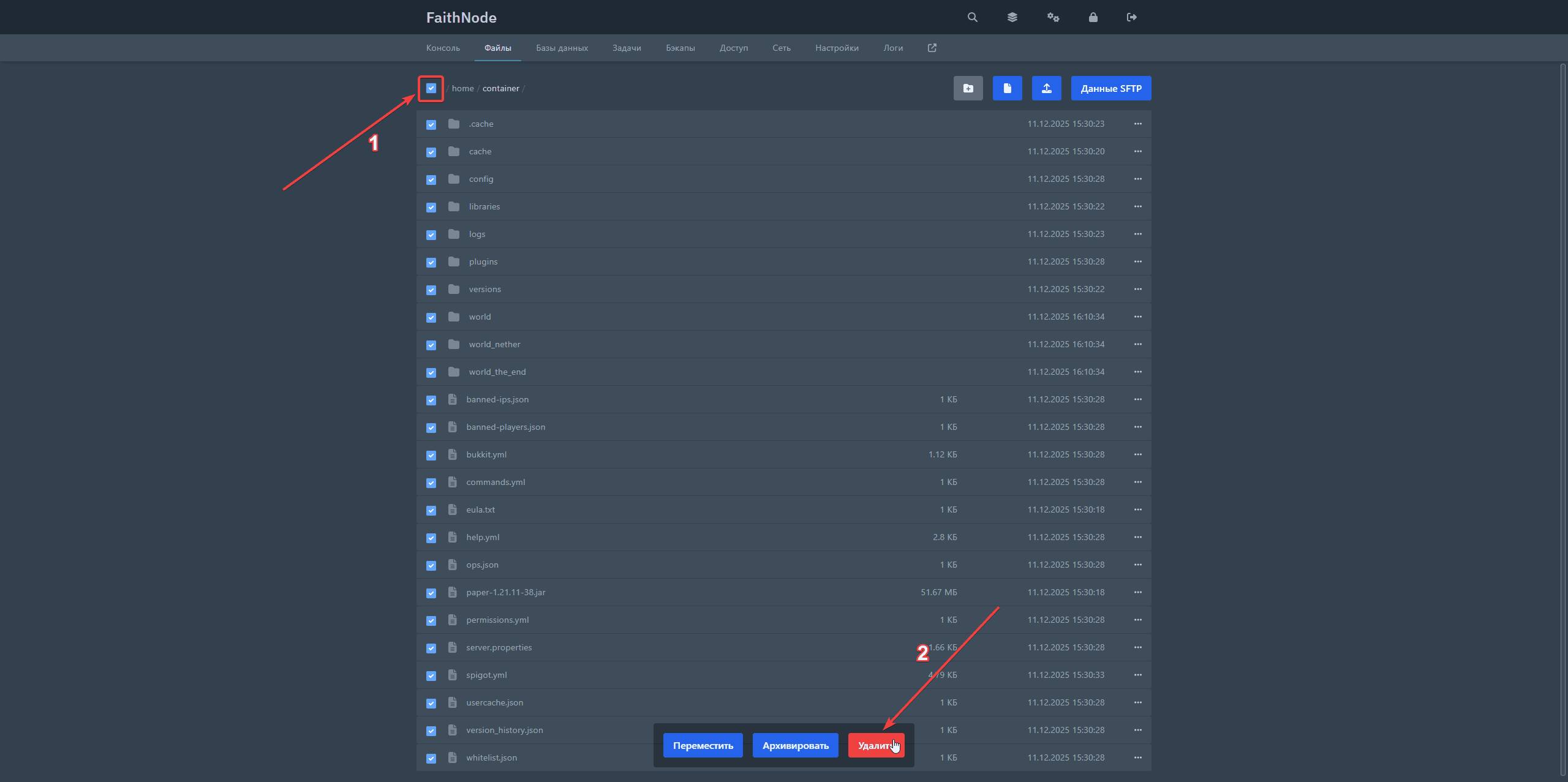 1. Выключите сервер и удалите все папки в вкладке "Файлы":