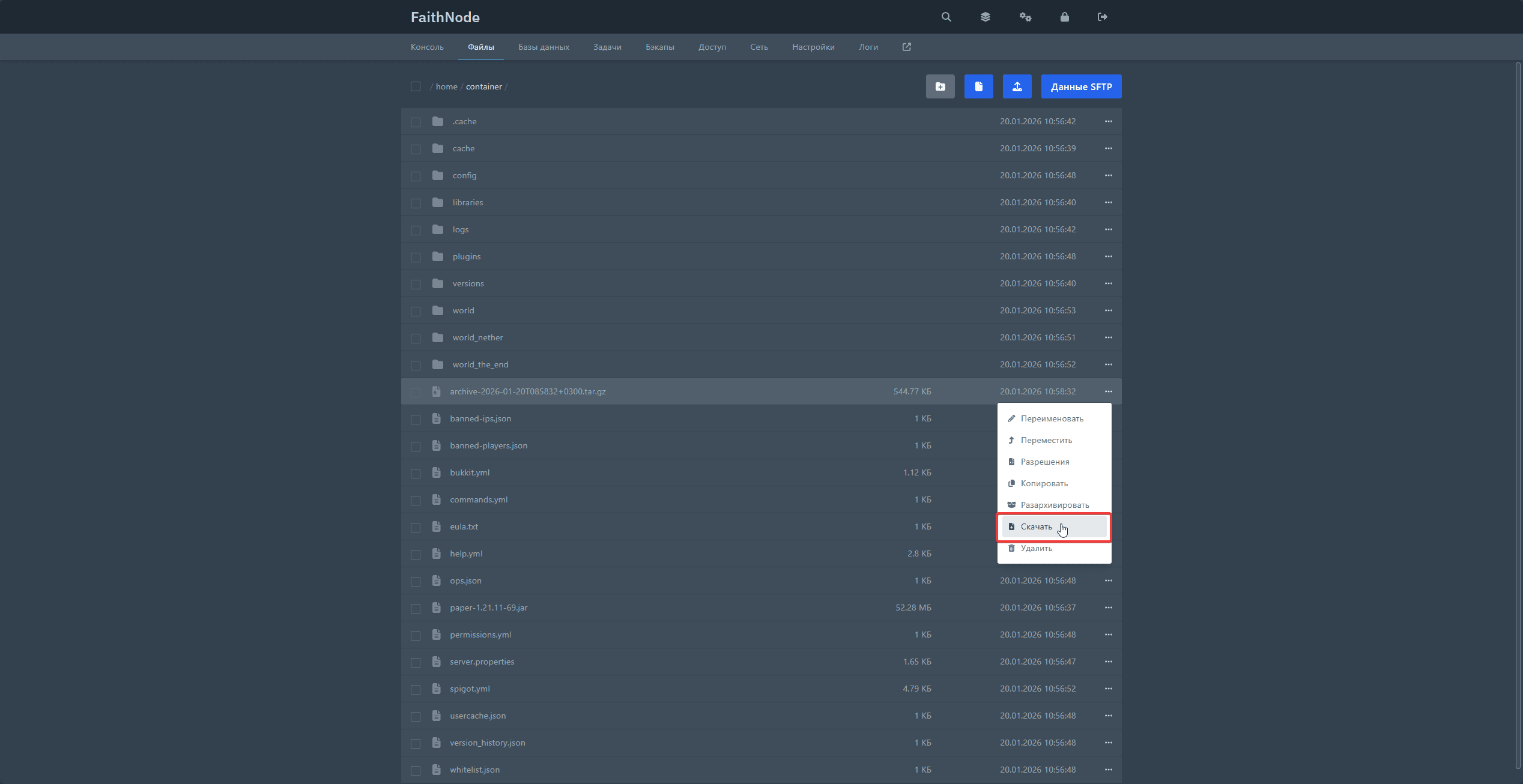 После архивации у вас появится .tar.gz архив в файлах, который нужно скачать.