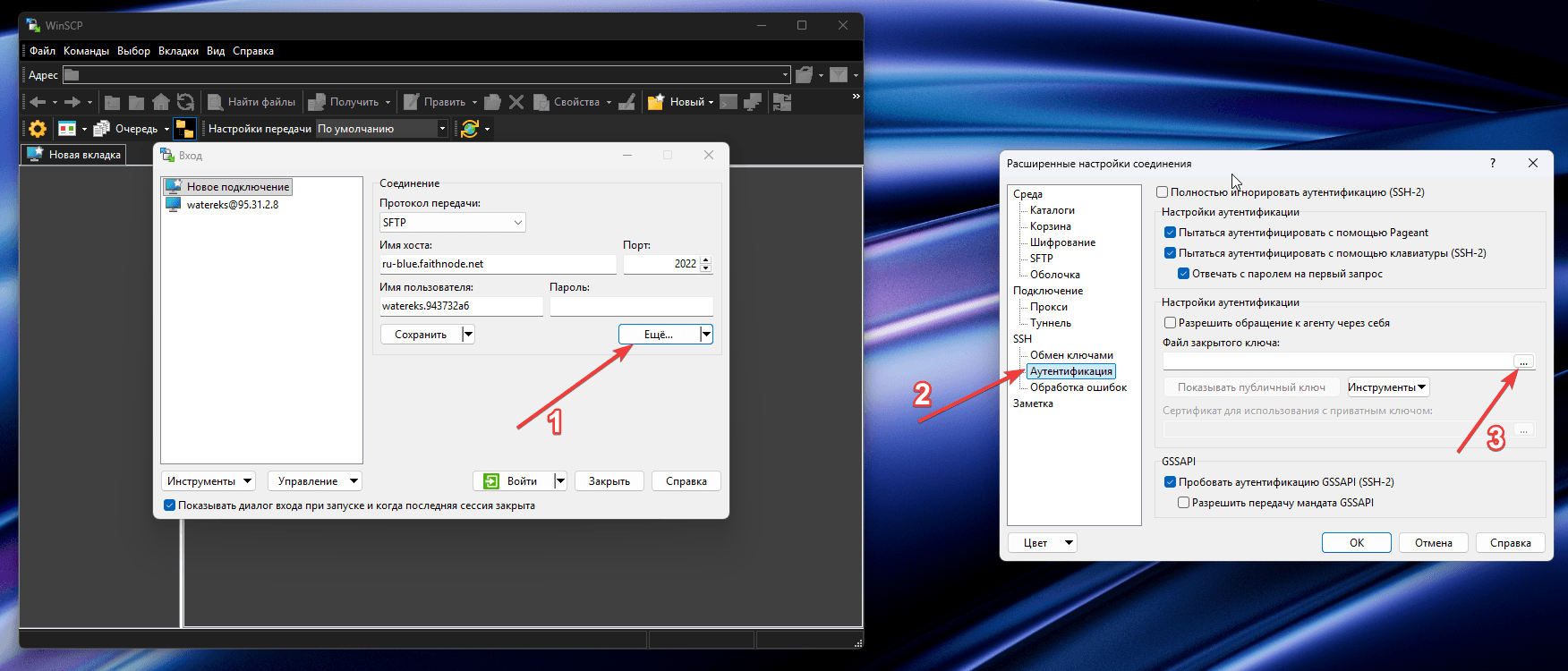 Далее жмем Ещё -> SSH - Аутентификация -> Жмем 3 точки у Файл закрытого ключа и выбираем файл id_rsa с Private key который мы ранее создали -> ОК -> Войти