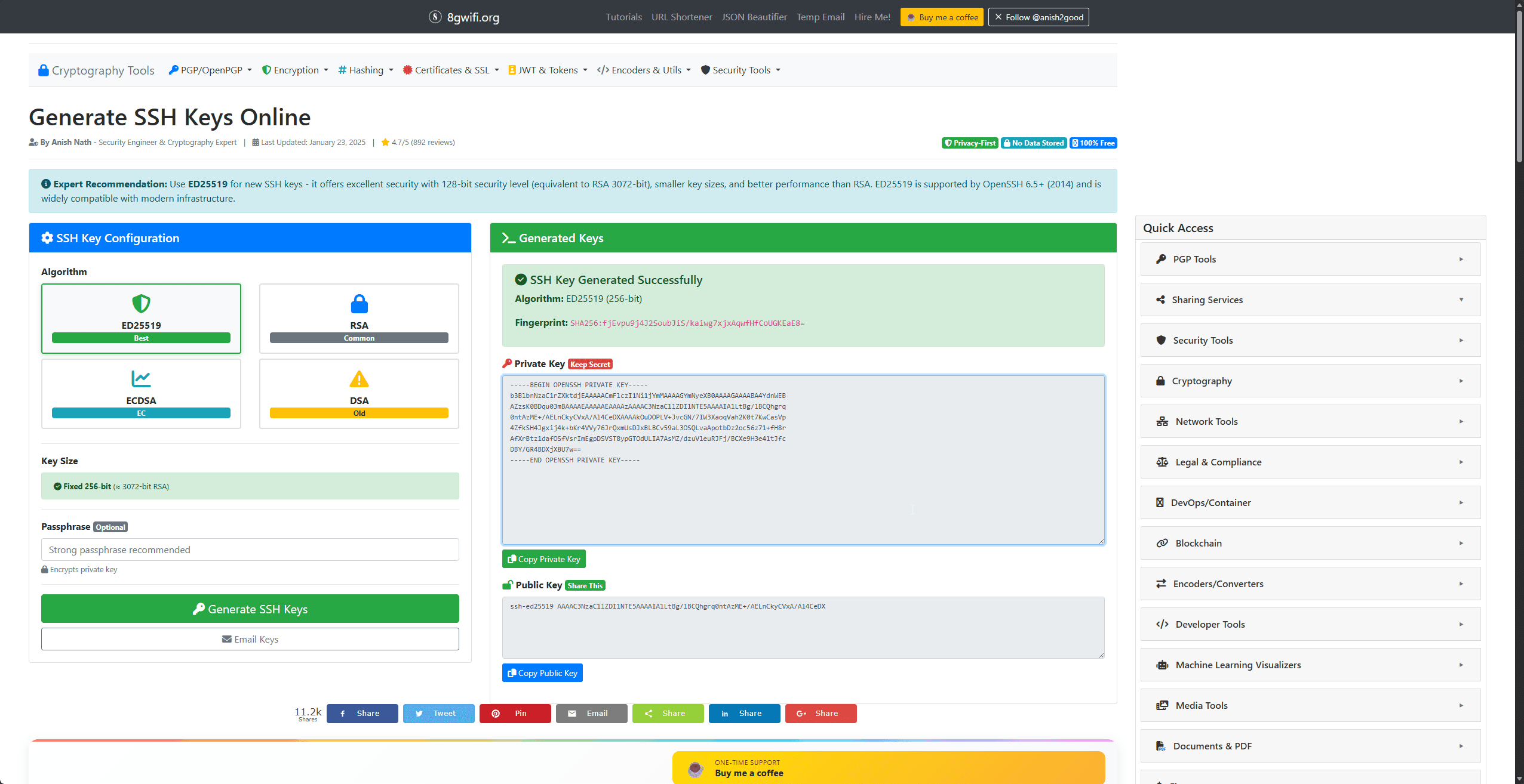На данном сайте вам требуется сгенерировать SSH ключ типа ed25519. в строке Passphrase можете указать свой произвольный пароль, который будет запрашиваться при использовании SSH ключа.
