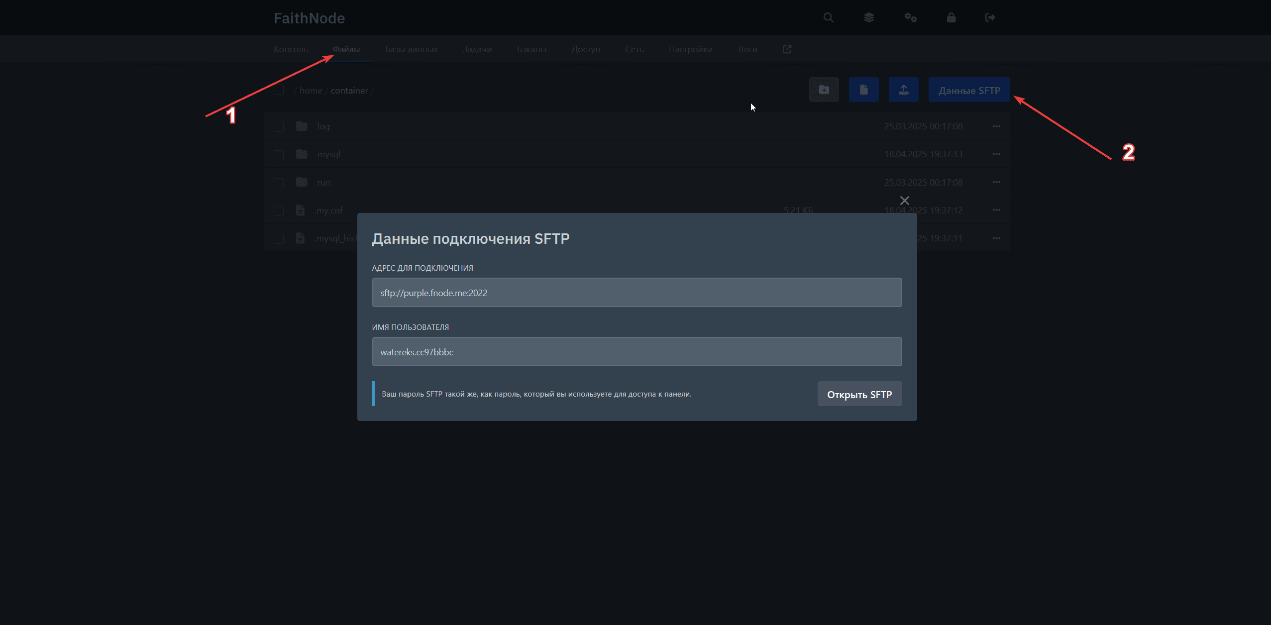Пароль для подключения такой же, как и от входа в вашу учетную запись на FaithNode.